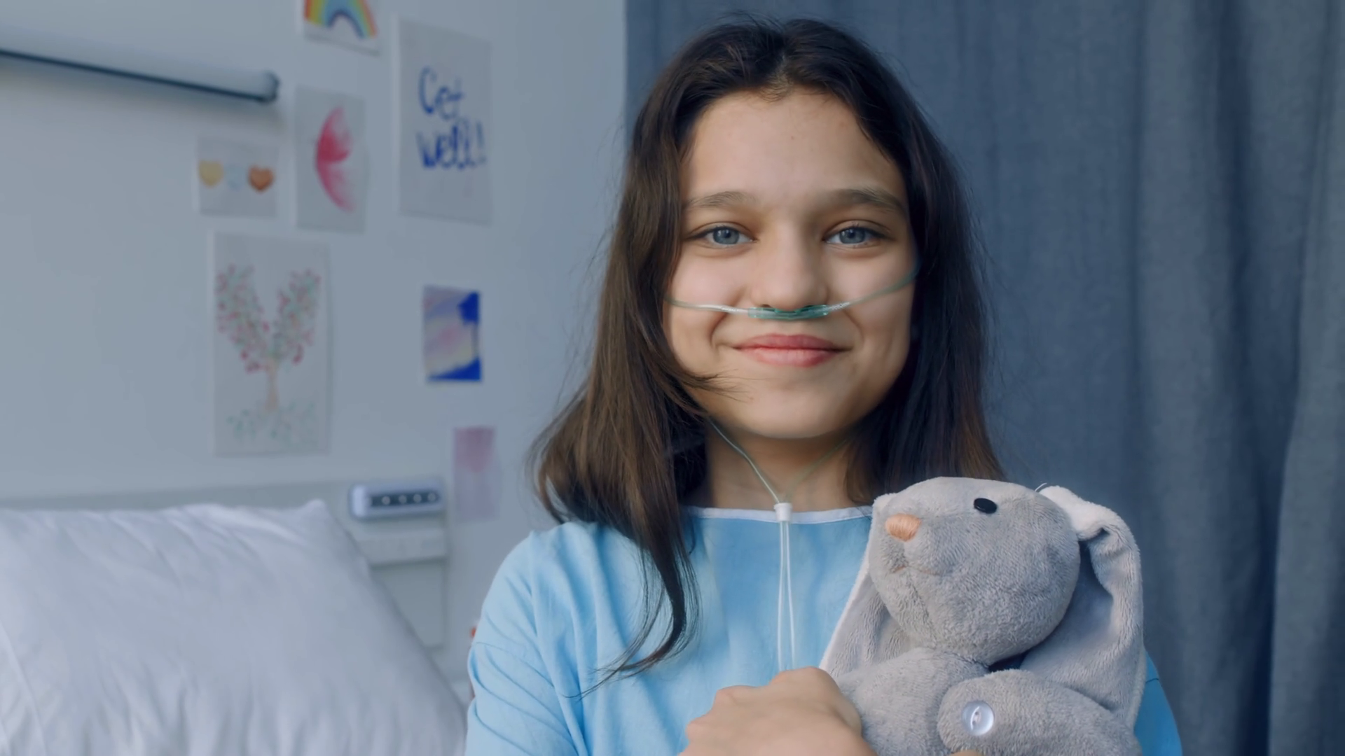Download royalty-free medical, lifestyle, and people stock footage of chest up portrait of happy caucasian 12yo girl with nasal prong embracing grey bunny
